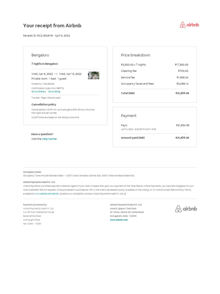Airbnb Travel Receipt, Confirmation Code HMP4EP4QW4 Airbnb Payments