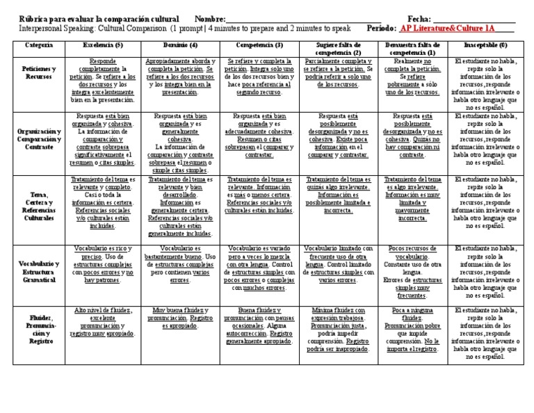 AP Spanish Cultural Comparison Rubric PDF Información Sicología