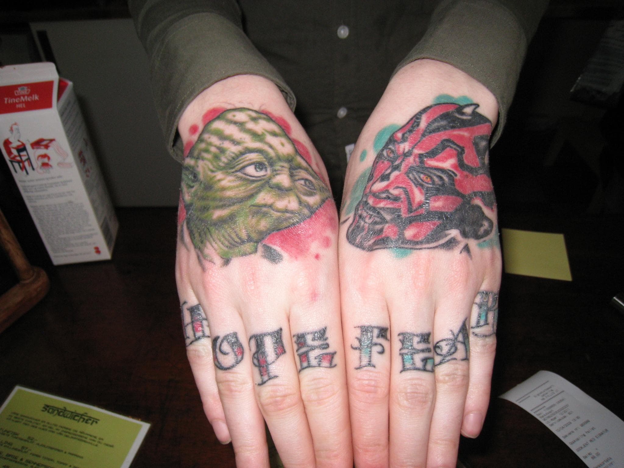 The most notable tattoo is the “love” and “hate” knuckle tattoo on his right hand, symbolizing his twisted duality of emotions.