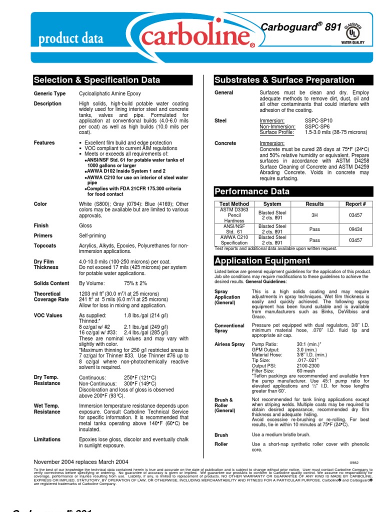 Carboline 890 Data Sheet - Highly chemical resistant epoxy mastic coating with exceptionally versatile uses in all industrial markets. Highly chemical resistant epoxy mastic coating with exceptionally versatile uses in all industrial markets. Discolation is more pronounced with 890 lt. Used as a tie coat over inorganic zincs. A mist coat of carboline 890 is required when applied over inorganic zincs to minimize bubbling. Carboguard® 890 gf product data sheet december 2021 1012 page 1 of 4 selection & specification data generic type. Prices and cost data if shown, are subject to change without prior notice. No other warranty or guarantee of any kind is.