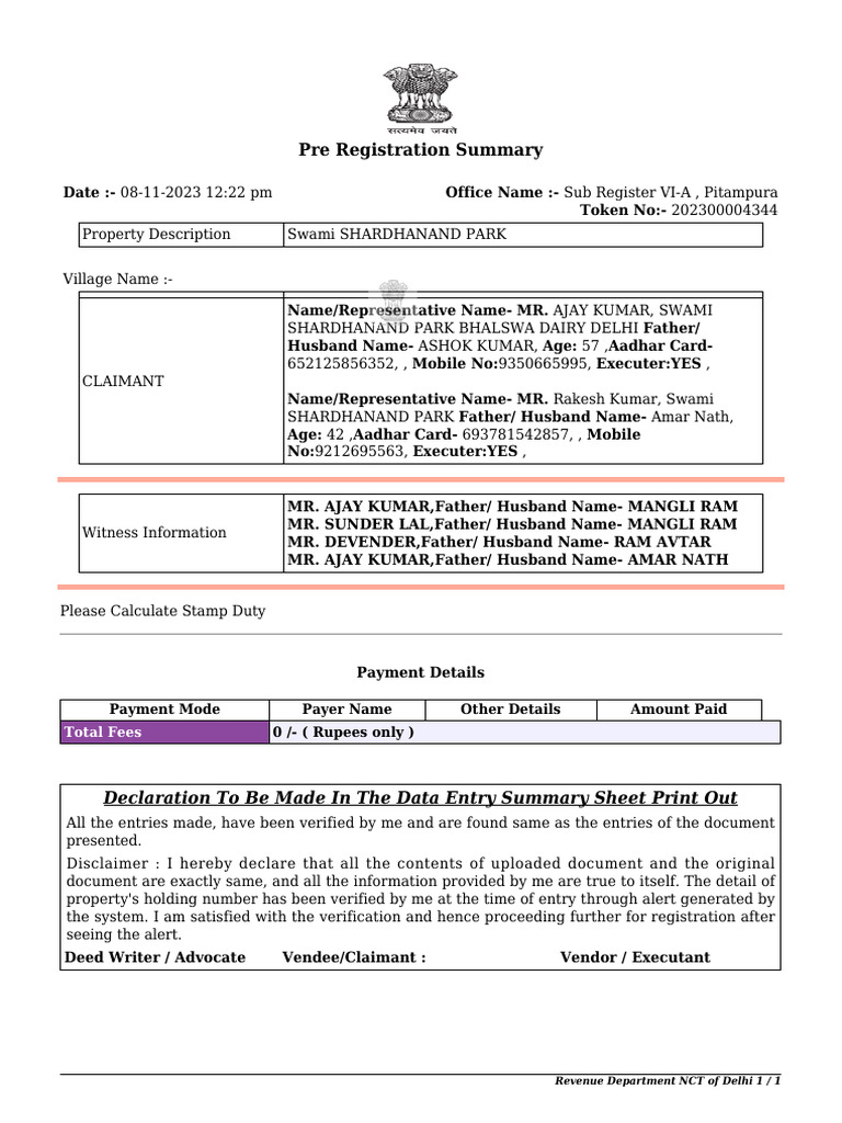 Pre Registration Summary Declaration To Be Made in The Data Entry
