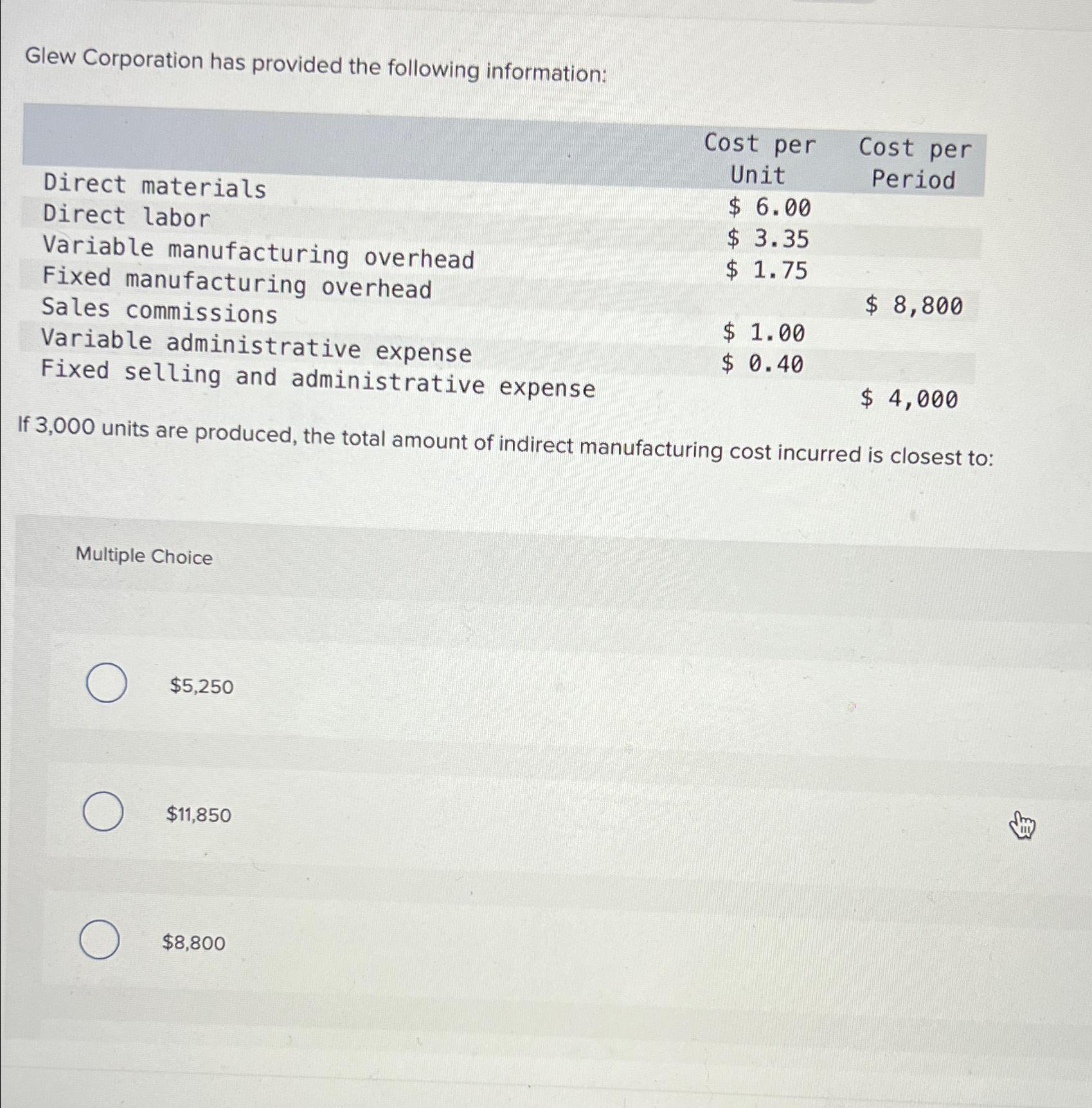 There are 3 steps to solve this one. Study with quizlet and memorize flashcards containing terms like glew corporation has provided the following information: The total cost per unit is a combination of direct materials, direct labor, variable manufacturing, sales commission,. Questions and answers for [solved] glew corporation has provided the following information: Direct manufacturing costs typically include direct materials.