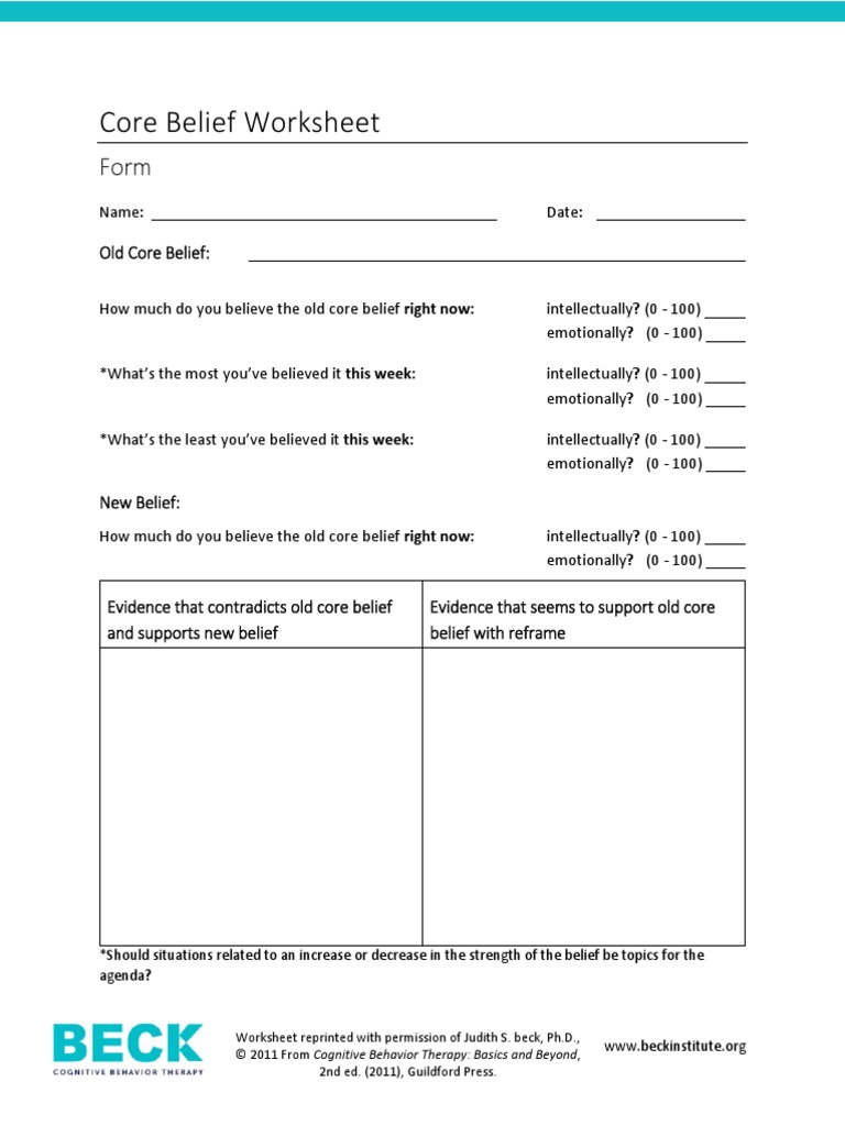 These beliefs tend to revolve around the themes of helplessness, unlovability, and worthlessness. The core beliefs info sheet includes a simple definition of core beliefs, along with examples showing how they affect thoughts, behaviors, and feelings. Are you aware of any rules you live by? The core beliefs worksheet 2 hones in on negative core beliefs about ourselves. Try completing.
