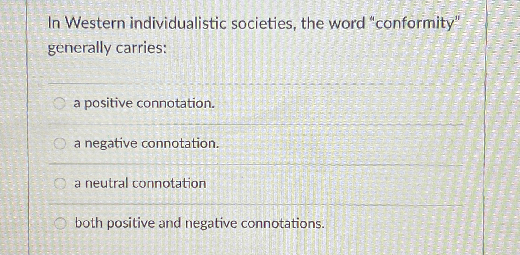 In western individualistic societies, the term 'conformity' generally carries negative connotations. Conformity that involves publicly acting in accord with an. In western individualistic societies, the word conformity carries. In western individualistic societies, the word conformity typically carries a negative value judgme. In western individualistic societies, the word conformity carries: