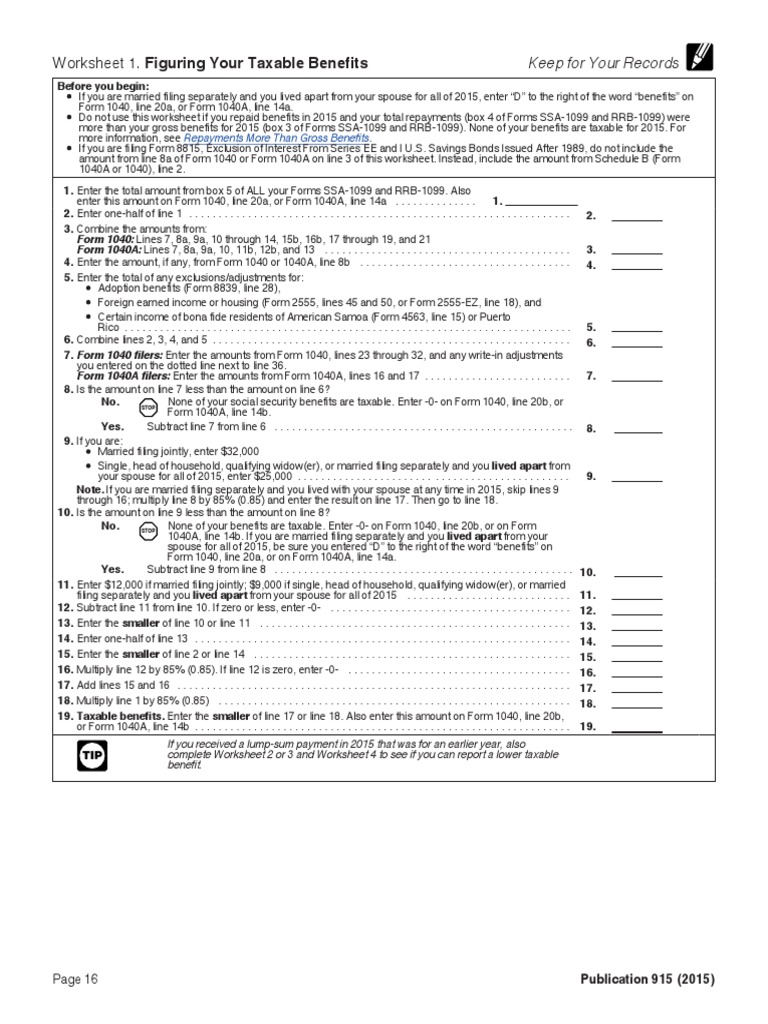 The social security benefits worksheet is created within turbotax when any social security benefits are entered. Irs publication 915, social security and equivalent railroad retirement benefits provides information concerning the taxability of. This worksheet is based on the worksheet in irs publication 915 social security and equivalent railroad retirement benefits. You can use the worksheets in irs publication 915 for.