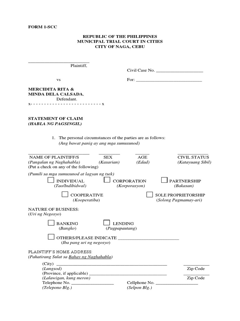 Small Claims FORM 1 SCC Lawsuit Complaint