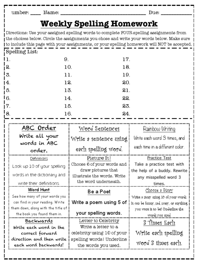 These spelling activities can be. Printable list of spelling homework ideas.