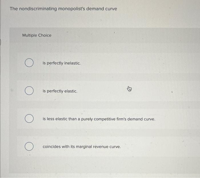 Study With Quizlet And Memorize Flashcards Containing Terms Like The Nondiscriminating Pure Monopolist's Demand Curve:, For An Imperfectly.